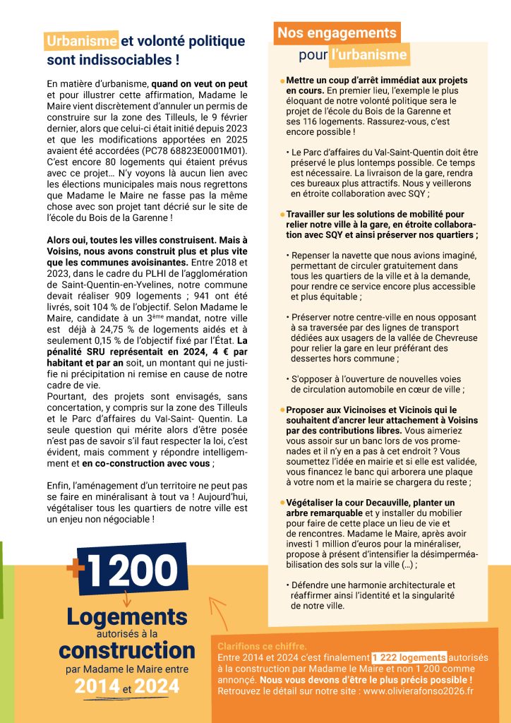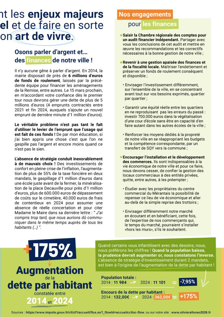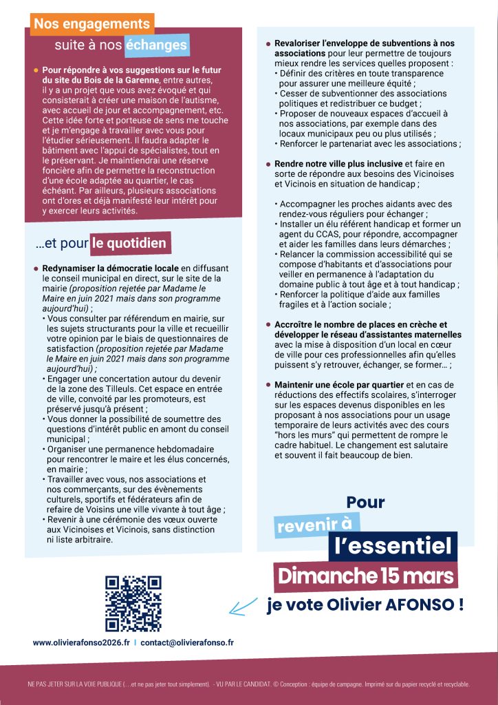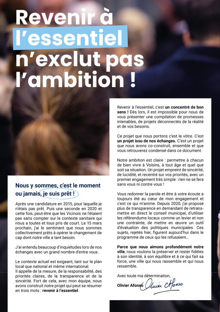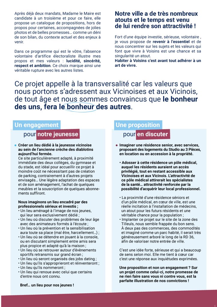 Ces dernières années, je n’ai pu que constater et regretter certaines des décisions prises par Madame le Maire et son équipe. Des choix trop souvent éloignés de cette exigence fondamentale qui est censée animer chaque élu : être au service de notre ville, de tous ses habitants, avec pour seule motivation l’intérêt général et pour ambition, un projet clair et non partisan. Revenir à l’essentiel !